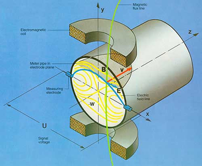 電磁流量計測量原理是基于法拉*電磁感應規(guī)律。流量計的測量管是一內襯絕緣材料的非導磁合金短管。兩只電*沿管徑方向穿通管壁固定在測量管上。其電*頭于襯里內表面基本齊平。勵磁線圈由雙向方波脈沖勵磁時,將在與測量管軸線垂直的方向上產(chǎn)生一磁通量密度為B的工作磁場。此時,如果具有一定電導率的流體流經(jīng)測量管,將切割磁力線感應出電動勢E。電動勢E正比于磁通量密度B,測量管內徑d與平均流速 的乘積、電動勢E(流量信號)由電*檢出并通過電纜送至轉換器。轉換器將流量信號放大處理后,可顯示流體流量,并能輸出脈沖,模擬電流信號,用于流量的測量和控制。