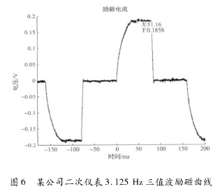 *先,采用某公司生產(chǎn)的二次儀表匹配一次儀表進行勵磁。該二次儀表采用在H橋低端設置恒流晶體管進行恒流控制的方法,其勵磁曲線結(jié)果如圖6所示,勵磁頻率為3.125Hz,勵磁方式為三值波勵磁,勵磁電流大約在51.16ms左右進入穩(wěn)態(tài),勵磁電流穩(wěn)態(tài)段波動較大。