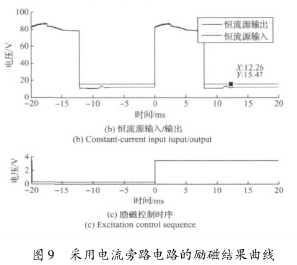 實驗結(jié)果表明,高壓源向低壓源切換后,三端穩(wěn)壓器的工作特性致使的電流波動和低壓源供電情況下的恒流控制,會大幅延長勵磁電流的穩(wěn)態(tài)響應時間。圖8所示勵磁電流約在17ms左右進入穩(wěn)態(tài),圖9所示勵磁電流的穩(wěn)態(tài)響應時間約為12ms。這表明,在采用三端穩(wěn)壓器搭建恒流控制電路的情況下,電流旁路電路能有效克服三端穩(wěn)壓器工作特性的影響,并能方便的實現(xiàn)電流超調(diào),加快勵磁電流的響應速度。