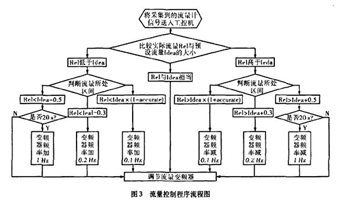 實際生產(chǎn)中流量一直在某個區(qū)域內(nèi)波動,且其動態(tài)特性不易掌握。從上面的理論中我們能夠讓誤差△£盡可能的小,這樣距我們所需要的理論值%就越接近。而減小誤差需要我們把n取的盡可能大,也就是在生產(chǎn)時間內(nèi)劃分更多的周期去調(diào)節(jié)流量。當(dāng)工控機(jī)根據(jù)雙氧水計量表傳送回來的信號發(fā)出調(diào)節(jié)變頻器工作頻率的指令后,電機(jī)調(diào)整功率到雙氧水計量表的實際測量為一個工作周期,我們知道從指令發(fā)送到實際測量值返回有一個較大的滯后,如果調(diào)節(jié)的周期時間小于流量計本身的一個工作周期,那么顯然不可能達(dá)到減小誤差的目的。利用模糊控制思想H。,在控制程序中我們把流量的波動區(qū)域劃分為±缸×Yo,Yo-t-O.3,Yo±0.5四個區(qū)域,其中缸為可調(diào)節(jié)的誤差范圍,生產(chǎn)中我們?nèi)?.015,流量區(qū)域劃分的單位均為t/h。針對不同的區(qū)域采取不同的調(diào)整方案。具體流程如圖3所示。圖中變量Rel表示實際測量的流量,變量Idea表示理論流量。