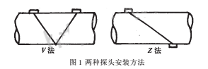 目前的流量計(jì)的基本測(cè)量原理和方法有以下三種:①時(shí)間差法,②相位差法,③頻率差法?,F(xiàn)在國(guó)內(nèi)外的大多數(shù)非接觸式超聲流量計(jì)使用的都是頻差法。例如富士株士會(huì)社生產(chǎn)的FLB-1型超聲流量計(jì)使用的就是這種方法。它提供了可供選擇的兩種探頭安裝方法。如圖1所示。其中V法適用于小管徑的管道,而Z法則適用于2000mm或更大管徑的管道。另外,當(dāng)無(wú)法提供合適的安裝間距時(shí),宜于采用Z法,因?yàn)閆法僅需V法間距的一半,同時(shí),在流體速度很高時(shí),也應(yīng)選擇Z法。當(dāng)管內(nèi)壁的污垢很厚時(shí),也不適用反射式的V法而選用Z法。但不論采用哪種方法,都很難排除隨機(jī)的噪聲干擾,造成較大的誤差。因此,我們?cè)O(shè)計(jì)了一種新型的相關(guān)式超聲流量計(jì)。