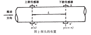 相關(guān)檢測(cè)技術(shù)在國(guó)內(nèi)外文獻(xiàn)中研究得很多,但在自來(lái)水流量測(cè)量中付諸實(shí)現(xiàn)仍是難的課題,本文所采用的相關(guān)檢測(cè)方法如圖2所示。在管道上裝有兩組傳感器,上游傳感器和下游傳感器,兩組傳感器之間距離L。相關(guān)檢測(cè)的實(shí)質(zhì)是測(cè)出流體通過(guò)線性系統(tǒng)時(shí),走過(guò)L長(zhǎng)的距離所需的時(shí)間T。