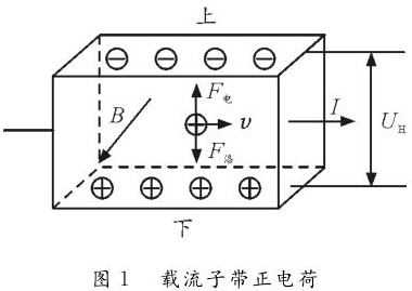 情形1:?jiǎn)畏N載流子。如圖1所示,若載流子帶正電荷,則載流子在洛倫茲力作用下會(huì)向下偏轉(zhuǎn),導(dǎo)體下表面積累正電荷。同時(shí),上表面失去正電荷而帶上負(fù)電,從而使下表面電勢(shì)高于上表面。