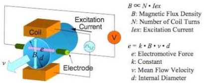 使用補水流量計測量的液體流量必須導(dǎo)電是非常重要的。法拉*定律表明,信號電壓(E)取決于平均液體速度(V),導(dǎo)體的長度(D)和磁場強度(B)。因此,將在管的橫截面中建立磁場。