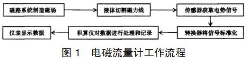 密封水流量計的產(chǎn)生主要是基于法拉*電磁感應(yīng)定律。在密封水流量計的應(yīng)用中,磁路系統(tǒng)會在流量計運行過程中逐步出現(xiàn)直流磁場與交流磁場,該磁場的產(chǎn)生為后期的測量提供了良好的前提條件,營造了測量所需的磁場環(huán)境,因此,在密封水流量計應(yīng)用時,一旦被測液體在導(dǎo)管中經(jīng)過該磁場環(huán)境時,必然會產(chǎn)生一定的切割磁力線運動,在這種情況下,電*傳感器就會發(fā)揮其作用,將導(dǎo)管內(nèi)的流量轉(zhuǎn)換為感應(yīng)電勢信號,隨后此轉(zhuǎn)換形成的信號逐步被傳遞給轉(zhuǎn)換器。而轉(zhuǎn)換器更是可以將所獲得的流量信號等加以處理,通過分析、對比等,轉(zhuǎn)換器會將該信號變?yōu)闃?biāo)準(zhǔn)信號,隨后將該信號輸出給積算儀,進一步進行信號的處理,這些處理以后的信號*終會在密封水流量計的儀表中顯示,呈現(xiàn)*終的流量測量結(jié)果,其基本的流程如圖 1 所示。