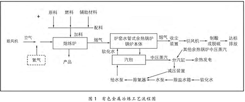 在有色金屬冶煉過程中,將原料、燃料和輔助材料根據(jù)熱平衡原理按一定比例進(jìn)行配料,配料后的物料與空氣或高含氧的混合空氣在熔煉爐中進(jìn)行氧化或還原反應(yīng),熔煉出有色金屬產(chǎn)品。同時,在熔煉過程中會產(chǎn)生大量的高溫?zé)煔猓?1200 ℃ 左右),高溫?zé)煔饨?jīng)過余熱鍋爐時,與余熱鍋爐水側(cè)的軟化水進(jìn)行熱量交換,煙溫迅速降至 250℃ 以下,再經(jīng)收塵、制酸或脫硫裝置進(jìn)一步收塵、降溫、凈化,*終達(dá)標(biāo)排放。余熱鍋爐水側(cè)的軟化水經(jīng)熱量交換后產(chǎn)生中壓飽和蒸汽(4 MPa 左右),送至余熱發(fā)電機(jī)組發(fā)電。具體的工藝流程如圖 1 所示。