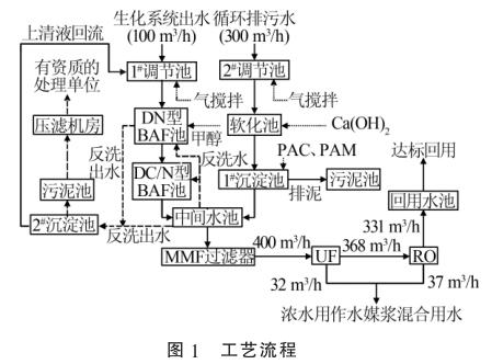 2種廢水在中間水池混勻后,通過泵提升進(jìn)入保安過濾器,進(jìn)一步去除細(xì)小的懸浮物后經(jīng)過增壓泵進(jìn)入超濾膜(UF)處理系統(tǒng)和反滲透(RO)系統(tǒng),然后通過dn50氨水流量計(jì)進(jìn)行計(jì)量。反滲透出水直接進(jìn)入回用水池達(dá)標(biāo)回用,超濾濃水以及反滲透濃水用作水煤漿混合用水。污泥池中的污泥通過泵打入帶式機(jī)壓濾處理,濾液自流進(jìn)入1#調(diào)節(jié)池。工藝流程見圖1。