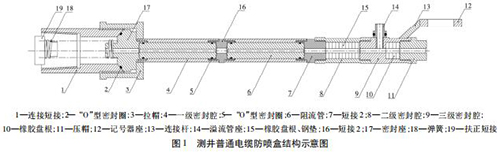 注入剖面測試中,溢流量對測量結果影響至關重要。如圖 1 所示,測井普通防噴盒采用 3 級密封: * 1 級密封為阻流管( 6) ,測 20 井次左右阻流管內徑變大,溢流量增加; * 2 級為橡膠盤根和鋼墊( 15) ; * 3 級為橡膠盤根( 10) ,調整壓帽( 11) 松緊程度,橡膠盤根抱緊電纜; * 2 級和* 3 級密封更換一次橡膠盤根測試 3 ~ 5 井次溢流量增加。普通防噴盒無法實現溢流量,沒有捕捉器、防噴器和放噴組裝件。普通電纜防噴裝置工作壓力20 MPa,耐壓 40 MPa。