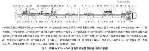 如圖 2 所示,DLFP14 - 70T 注脂防噴盒有 1 個注脂口、1 個回脂口、1 個防噴盒液控口、1 個刮纜器液控口及1 個溢流口,主體內裝有 6 根阻流管。DLFP14 - 70T 注脂防噴盒采用 4 級密封: * 1 級密封采用注脂密封,撬裝注脂泵從注脂口注入高壓高粘度密封脂于 6 根阻流管與電纜間隙; * 2 級密封采用液壓密封,氣動液壓泵主加壓和手壓泵補加壓結合從防噴盒液控口注入液壓油,推動活塞擠壓膠芯壓筒; * 3 級密封采用液壓密封,手壓泵加壓從刮纜器液控口注入液壓油,推動活塞擠壓膠芯壓筒實現密封和刮油作用; * 4 級密封油杯、橡膠盤根和刮油環(huán)( 鋼 墊) 。DLFP14 - 70T 注脂防噴裝置配有液控上、下捕捉器、液控雙閘板防噴器和放噴組件,根據實際可以調整溢流量,實現零溢流密閉測井施工。 DLFP14 - 70T 注脂防噴裝置工作壓力 70 MPa,耐壓105 MPa。
