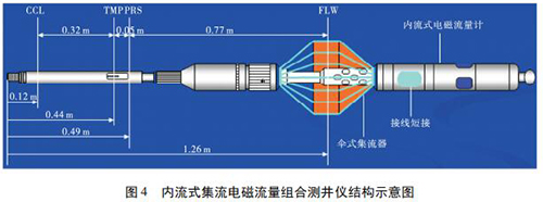 1. 2 內流式集流智能高溫水流量計如圖 4 所示,內流式集流電磁組合測井儀主要采用內流式集流智能高溫水流量計,并組合了井溫壓力磁定位儀。利用電磁感應原理測量平均流速,體積流量計算公為: