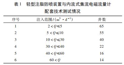在實際應用中,使用輕型注脂防噴裝置與內流式集流智能高溫水流量計配套技術對喇叭口在射孔層上注聚井進行測試。輕型注脂防噴裝置與內流式集流智能高溫水流量計配套技術施工工藝參見文獻,測試情況見表 1 所示,低注入量井( ≤10 m3 /d) 占到 56. 60% 。