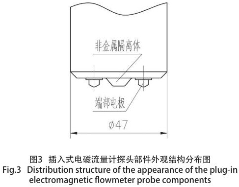 通過大量的試驗(yàn),對(duì)探頭端部外型結(jié)構(gòu)亦采用特殊設(shè)計(jì),從而消除兩個(gè)電*之間的擾流現(xiàn)象,同時(shí)亦消除因通電產(chǎn)生磁場(chǎng),導(dǎo)致兩個(gè)電*吸附介質(zhì)中的鐵屑而影響測(cè)量精度和死區(qū)效應(yīng),增強(qiáng)了輸出信號(hào)的穩(wěn)定性,從而提高傳感器準(zhǔn)確度和抗干擾性。通過結(jié)構(gòu)的優(yōu)化設(shè)計(jì),使用壽命更長(zhǎng),酸水流量計(jì)探頭局部,如圖 3 所示。