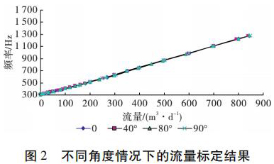 為了考察井眼斜度變化對進(jìn)水流量計(jì)測量流量的影響,開展了非集流進(jìn)水流量計(jì)在不同斜度情況下的流量測量模擬實(shí)驗(yàn)。模擬實(shí)驗(yàn)在大慶油田多相流實(shí)驗(yàn)室進(jìn)行,儀器外徑 38 mm,模擬井筒內(nèi)徑為 124 mm,實(shí)驗(yàn)介質(zhì)是水,傾斜角度分別為 0°、40°、80°和 90°( 水平) ,流量范圍為 5 ~ 850 m3 /d。實(shí)驗(yàn)結(jié)果表明,在儀器居中條件下,井眼斜度變化對進(jìn)水流量計(jì)的儀表常數(shù)沒有影響,滿量程誤差不大于 4% ,因此可以應(yīng)用進(jìn)水流量計(jì)進(jìn)行水平井注水剖面測量。不同角度情況下的實(shí)驗(yàn)結(jié)果如圖 2 所示。