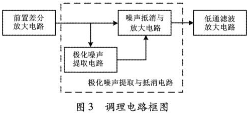 根據(jù)前饋控制的自適應*化噪聲抵消原理,設計了信號調(diào)理電路2,以實現(xiàn)*化噪聲的濾除。信號調(diào)理電路2主要包括前置差分放大電路、*化噪聲提取與抵消電路、低通濾波放大電路三部分。調(diào)理電路如圖3所示。