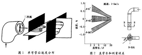流體流過(guò)彎管由于離心力作用,靠外壁產(chǎn)生擴(kuò)散效應(yīng),內(nèi)壁產(chǎn)生收縮效應(yīng),由此產(chǎn)生橫向流動(dòng)的二次流,引起下游產(chǎn)生速度分布畸變,如圖1所示
