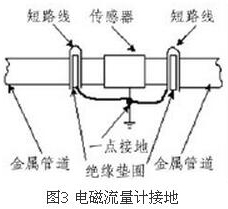 (4)盡量避開振動源、磁源(大功率電機、變壓器)由于管道水流量表的測量感應(yīng)電壓很小,電壓較低,易受外界電磁噪聲的影響,故在安裝時應(yīng)進行可靠的接地連(跨)接。金屬管道管道水流量表接地連(跨)接方法如圖3所示