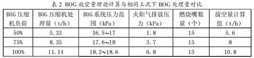為維持 BOG 系統(tǒng)壓力穩(wěn)定,在正常工況下通過 BOG壓縮機(jī)回收 BOG 方式進(jìn)行,在檢修期間采用火炬放空方式進(jìn)行。從表 2 中可以看出,在系統(tǒng)壓力維持一定值時(shí),理論計(jì)算值與 BOG 壓縮機(jī)處理量基本相同,火炬氣放空量 計(jì)算方法可行。
