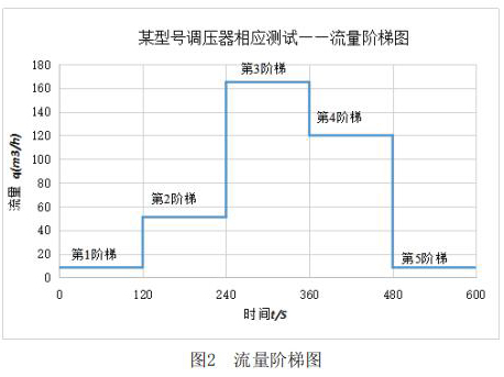 該測(cè)試主要利用實(shí)驗(yàn)室測(cè)試條件,模擬客戶現(xiàn)場(chǎng)使用情況。其主要測(cè)試內(nèi)容包括:測(cè)試電磁流量計(jì)在+23℃,-30℃和-40℃三種溫度下,電磁流量計(jì)出口壓力分別在2.1kPa和30kPa時(shí),流量分別從*1階梯到*5階梯時(shí)的響應(yīng)速度,客戶所提供的流量階梯如圖2所示。橫軸表示下游球閥開(kāi)啟動(dòng)作時(shí)間,縱軸表示循環(huán)水流量計(jì)下游需要的流量q。
