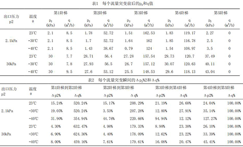通過(guò)實(shí)驗(yàn)室的模擬測(cè)試,對(duì)于2.1kPa和30kPa出口設(shè)定壓力,分別得到的6條曲線,3條不同溫度下的壓力曲線和3條不同溫度下的流量曲線,如圖4和圖5所示。在*120s、240s和360s時(shí),由于流量突然增加,造成出口壓力瞬時(shí)降低。在*480s時(shí),由于流量突然減小,造成出口壓力瞬時(shí)升高。圖中的橫軸表示球閥的動(dòng)作響應(yīng)時(shí)間,*一縱軸對(duì)應(yīng)電磁流量計(jì)出口壓力p2,*二縱軸表示電磁流量計(jì)對(duì)應(yīng)該出口壓力下流量q。