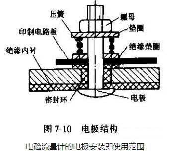 傳感器的電*安裝在與磁場垂直的測量管兩側(cè)管壁上,它的作用是把被測介質(zhì)切割磁力線所產(chǎn)生的電勢信號(流量信號)引出,因此電*一般需直接與被測介質(zhì)接觸,其典型結(jié)構(gòu)如圖7-10所示。