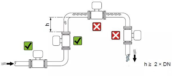 在豎直向下管道中安裝時(h ≥ 5 m (16.4 ft)),需要在傳感器的下游管道中安裝帶泄放閥的虹吸管, 避免出現(xiàn)低壓,以及抽壓時損壞測量管。此措施還可以防止系統(tǒng)的測量精度降低。