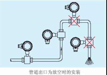 確保流量傳感器在測量時,管道中充滿被測流體,不能出現非滿管狀態(tài)。如管道存在非滿管或是出口有放空狀態(tài),傳感器應安裝在一根虹吸管上。