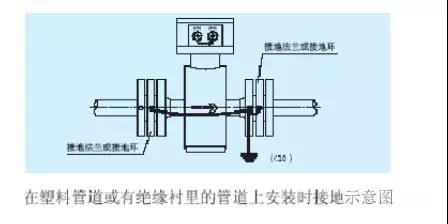 b.傳感器在塑料管道上或在有絕緣襯里的管道上安裝,傳感器的兩端應安裝接地環(huán)、或接地法蘭、或帶有接地電*的短管,按下圖接地。使管內流動的被測介質與大地短路,具有零電位,否則,廢水流量計無法正常工作。