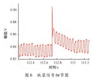 為了進(jìn)一步研究水煤漿信號的特點(diǎn),將其與紙漿信號進(jìn)行對比。通過分析課題組采集的25Hz矩形波勵磁下的紙漿信號發(fā)現(xiàn),在同樣流速下,測量介質(zhì)為紙漿時,傳感器輸出信號經(jīng)調(diào)理放大后能明顯看到與流量相關(guān)的感應(yīng)電動勢信號,且其漿液干擾僅為數(shù)十毫伏,要遠(yuǎn)小于水煤漿信號中的漿液干擾,如圖5所示。對圖5所示的紙漿信號進(jìn)行局部放大,得到如圖6所示的信號。可見,紙漿信號中的漿液干擾持續(xù)的時間也遠(yuǎn)小于水煤漿信號中的漿液干擾,且頻率較低。