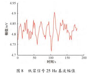 在頻域中對紙漿信號觀察時發(fā)現(xiàn),紙漿信號的漿液噪聲頻帶在零頻率點(diǎn)附近,距離流量信號基波頻率點(diǎn)較遠(yuǎn),對基波幅值和各奇次諧波幅值基本沒有影響,紙漿信號在頻域中的圖形如圖7所示。選擇一組采集的紙漿信號,把其等分成數(shù)段,利用MATLAB計算每段數(shù)據(jù)在基波處的幅值并提取保存在一個數(shù)組中,使用繪圖工具畫出來,如圖8所示??梢?,基波幅值在4.7~4.95mV變化,波動較小。因此,提取到的與流量相關(guān)的感應(yīng)電動勢信號幅值會比較穩(wěn)定。