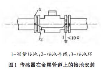 (4) 傳感器安裝在金屬管道上,可將傳感器的接地導(dǎo)線按制造廠的要求連接在2側(cè)管道法蘭上,形成可靠的接地回路(見圖1)。儀表的接地點應(yīng)是一個獨立的接地點,不允許與其他電氣設(shè)備的接地線連接在一起。