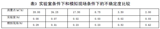 實(shí)驗(yàn)室條件下和模擬現(xiàn)場(chǎng)條件下的不確定度比較(表3)兩次結(jié)果可以看出,兩次實(shí)驗(yàn)各個(gè)流量點(diǎn)的不確定度差距非常大??梢?jiàn),砂漿流量計(jì)對(duì)安裝條件還是比較苛刻的。