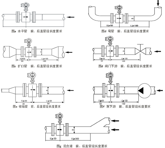 上述2、3、4項(xiàng)情況,流量計(jì)上、下游須裝異徑管。異徑管中心錐角應(yīng)不大于15°,且異徑管上游至少有5倍工藝管道直徑的直管段。