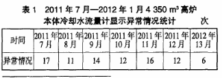 本體流量計(jì)工作平臺(tái)的煤氣濃度(全文中“煤氣濃度”均指“質(zhì)量分?jǐn)?shù)”)*小為900×10-6,一般情況為1100×10-6~1 200×10-6,*高時(shí)可達(dá)1800×10-6,而實(shí)際工作時(shí)的安全工作范圍是低于160×10-6。如此大的煤氣濃度的工作平臺(tái)使得在處理故障的過程中存在較大的安全隱患。表1是對(duì)2011年7月—2012年1月4 350m³高爐本體冷卻水流量計(jì)顯示異常情況進(jìn)行的統(tǒng)計(jì)。