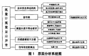 通過頭腦風(fēng)暴法對(duì)流量計(jì)顯示異常原因進(jìn)行查找,繪制系統(tǒng)圖(見圖1)來進(jìn)行原因分析。