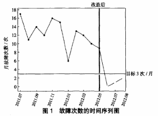 通過實(shí)施改進(jìn)措施之后,繪制2011年7月—2012年8月本體流量計(jì)故障次數(shù)時(shí)間序列圖(圖3)。圖3中圓點(diǎn)表示改造前故障次數(shù),三角形表示改造之后故障次數(shù)。由圖3可以看出,改造前故障次數(shù)全部在控制限以外;改造之后故障次數(shù)全部在控制限內(nèi),均已達(dá)到3次/月的控制目標(biāo)。