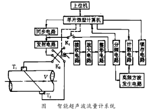 智能超聲波流量計的系統(tǒng)結(jié)構(gòu)如圖2所示。其工作過程是:在上位機的控制下,單片機先對計數(shù)器清零,使開關(guān)K1閉合,K2合向下邊,然后控制同步電路發(fā)出同步啟動脈沖,觸發(fā)超聲波換能器T1發(fā)射*1個超聲脈沖波,同時使計數(shù)電路開始對周期為f的高頻方波進行計數(shù)。該超聲脈沖順流傳播,至T2處被接收并轉(zhuǎn)換成電信號,經(jīng)過放大、整型,一部分返回代替同步信號觸發(fā)T1再次發(fā)射超聲波,如此反復形成順流發(fā)射聲循環(huán),另一部分進入分頻電路進行分頻。當聲循環(huán)M次,分頻器滿并產(chǎn)生一信號,關(guān)斷高頻方波,使計數(shù)停止計數(shù)。同時單片機斷開K1停止聲循環(huán),讀取鎖存器中的順流發(fā)射聲循環(huán)計數(shù)值N1。然后單片機再對計數(shù)器清零,再使開關(guān)K1閉合,K2 合向上邊,觸發(fā)換能器T2 發(fā)射。此次,T2 發(fā)射T1接收,形成逆流發(fā)射聲循環(huán),同樣可得到逆流發(fā)射聲循環(huán)計數(shù)值N2。當聲循環(huán)次數(shù)M足夠大,由于統(tǒng)計作用,上述2次聲循環(huán)的固有電聲延遲 (包括超聲波經(jīng)過換能器透聲斜楔、管圖2智能超聲波流量計系統(tǒng)壁等所需的時間以及電信號滯后的時間)之和是相等的,于是當f已知且固定不變時,根據(jù)上述公式可將2個計數(shù)值之差 (N2 -N1)換算成流體流速V和流量Q。