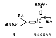 超聲波發(fā)射和接收電路的優(yōu)劣對整機性能影響很大。本流量計聲循環(huán)頻率達30kHz以上,而傳統(tǒng)的超聲波發(fā)射電路都是由可控硅構(gòu)成,開關(guān)速度慢,使得工作頻率只有幾kHz,無法滿足要求,因此選用新型MOS作為發(fā)射元件,不但提高了工作速度,而且還提高發(fā)射工作電壓,增大了發(fā)射信號強度。如圖3所示,當外加觸發(fā)脈沖時,MOSFET導通,電容C迅速放電,產(chǎn)生一個高壓負脈沖,驅(qū)動超聲波換能器發(fā)射超聲波。