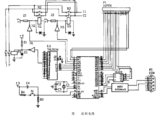 圖中單片機89C5 1和譯碼器74LS139構(gòu)成計數(shù)板上鎖存器的片選信號,通過片選信號和P0口讀入計數(shù)值;單片機89C5 1、譯碼器74LS15 4和繼電器D1可切換檢測多個定子線棒支路間的超聲信號;繼電器D2和D3等完成一組超聲換能器收發(fā)功能的互換;單片機RXD和TXD引腳經(jīng)RS - 2 32電平變換,完成同上位機的通訊任務。